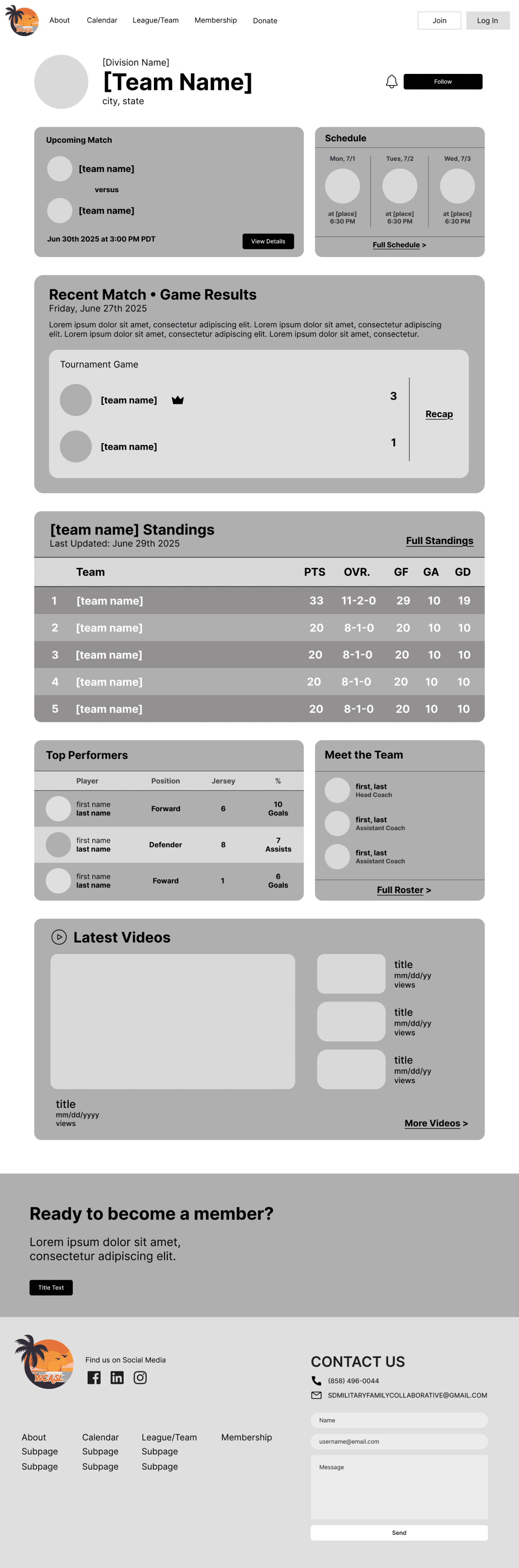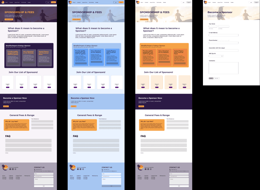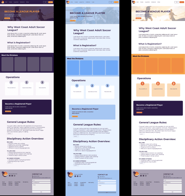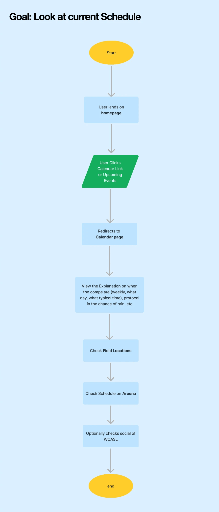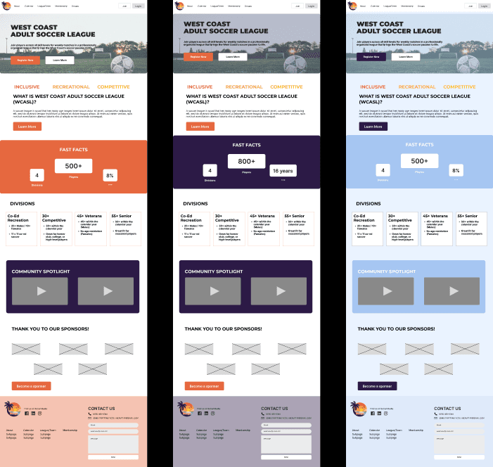 We did a competitive analysis with other sports league websites for inspiration on format, content, and branding. I also researched and compared different platforms (Wix, Webflow, etc.) to host the site on. We ultimately decided on Squarespace, where the original website was built, for our client's future convenience.